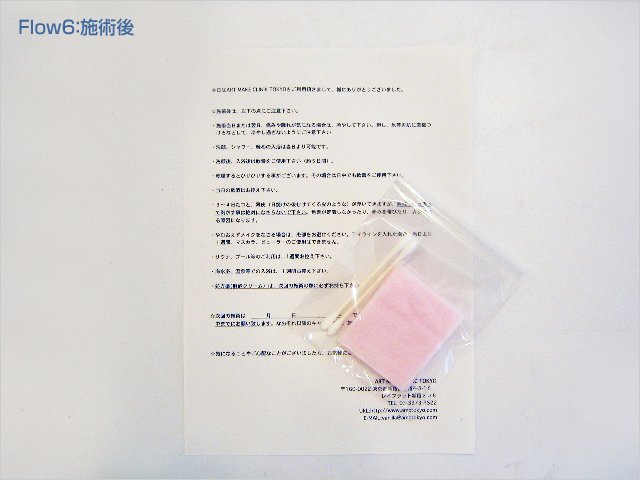 - 軟膏(ワセリン)を塗って施術部位を保護します。患部を避けてのお化粧等直しは可能です。洗顔、入浴は基本的に可能です。